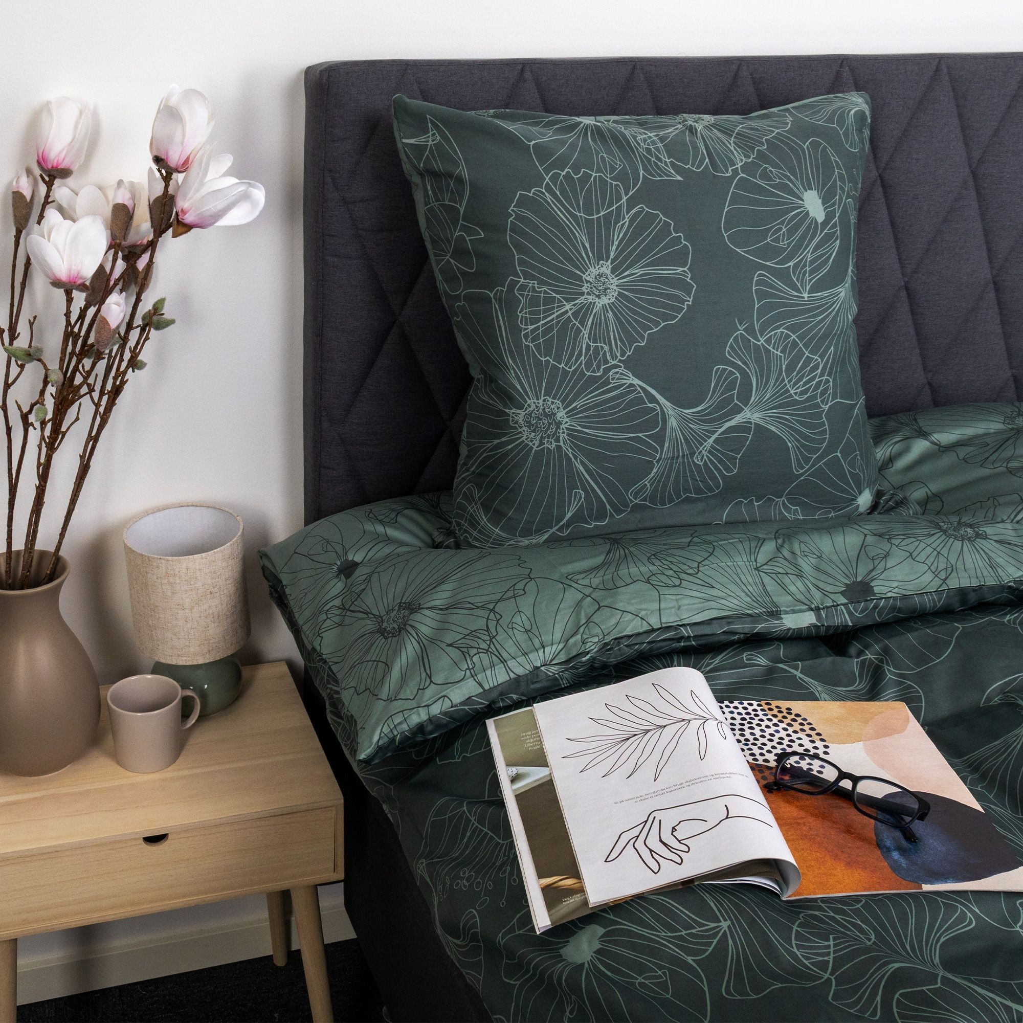 Det vendbare design giver dig to forskellige looks i ét sengesæt. Forsiden har et elegant blomsterprint i en lysegrøn farve, mens bagsiden er mørkegrøn. Det gør sengetøjet nemt at kombinere med forskellige farver, puder og plaider og giver større fleksibilitet i indretningen.