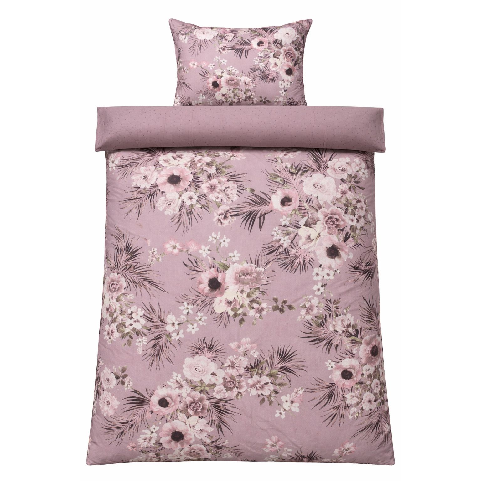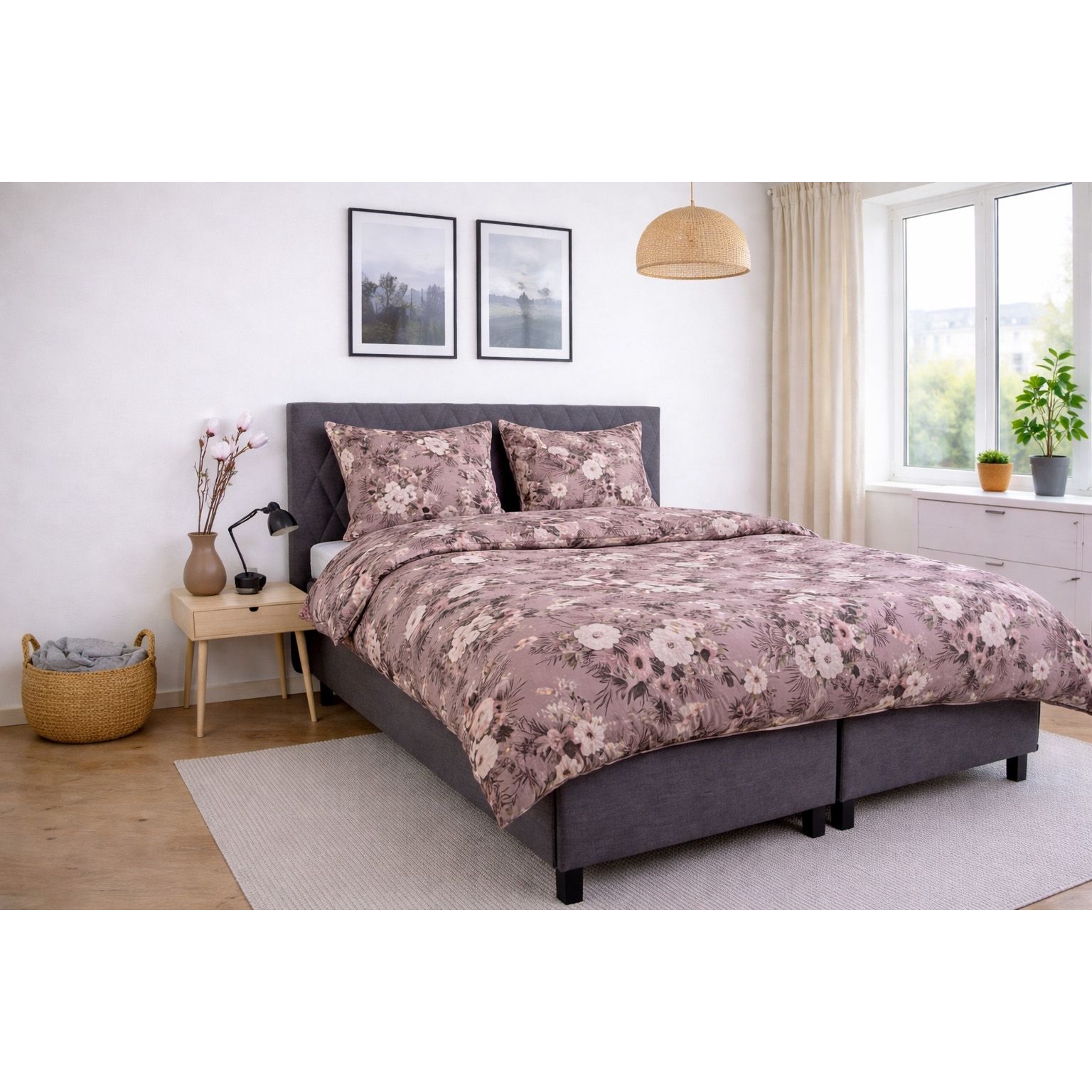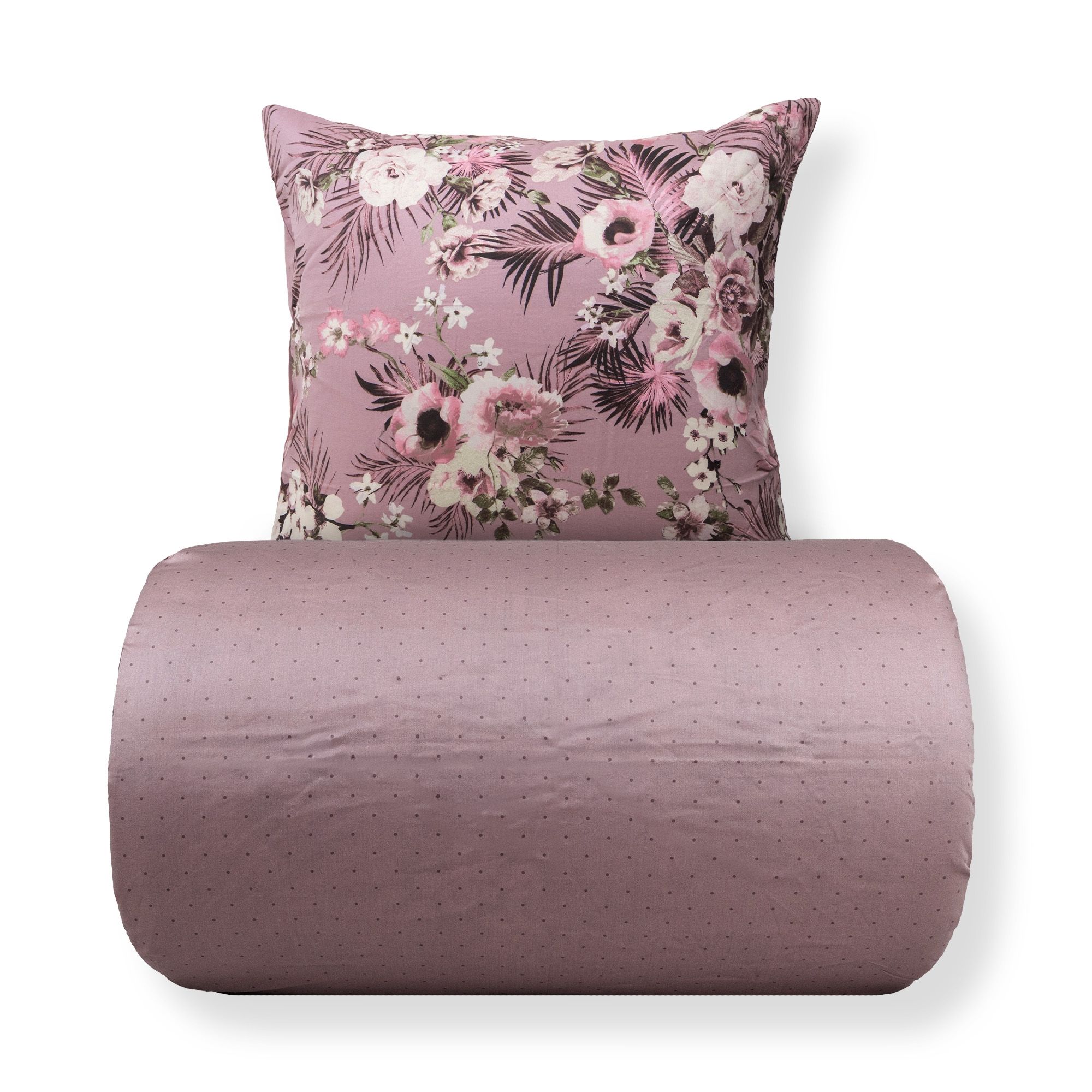 Skab en stemningsfuld og elegant atmosfære i soveværelset med dette smukke sengesæt i 100% bomuldssatin. Sengetøjet kombinerer et dekorativt blomsterprint med et mere roligt prikket design på bagsiden, så du nemt kan skifte udtryk i soveværelset ved blot at vende sengetøjet.