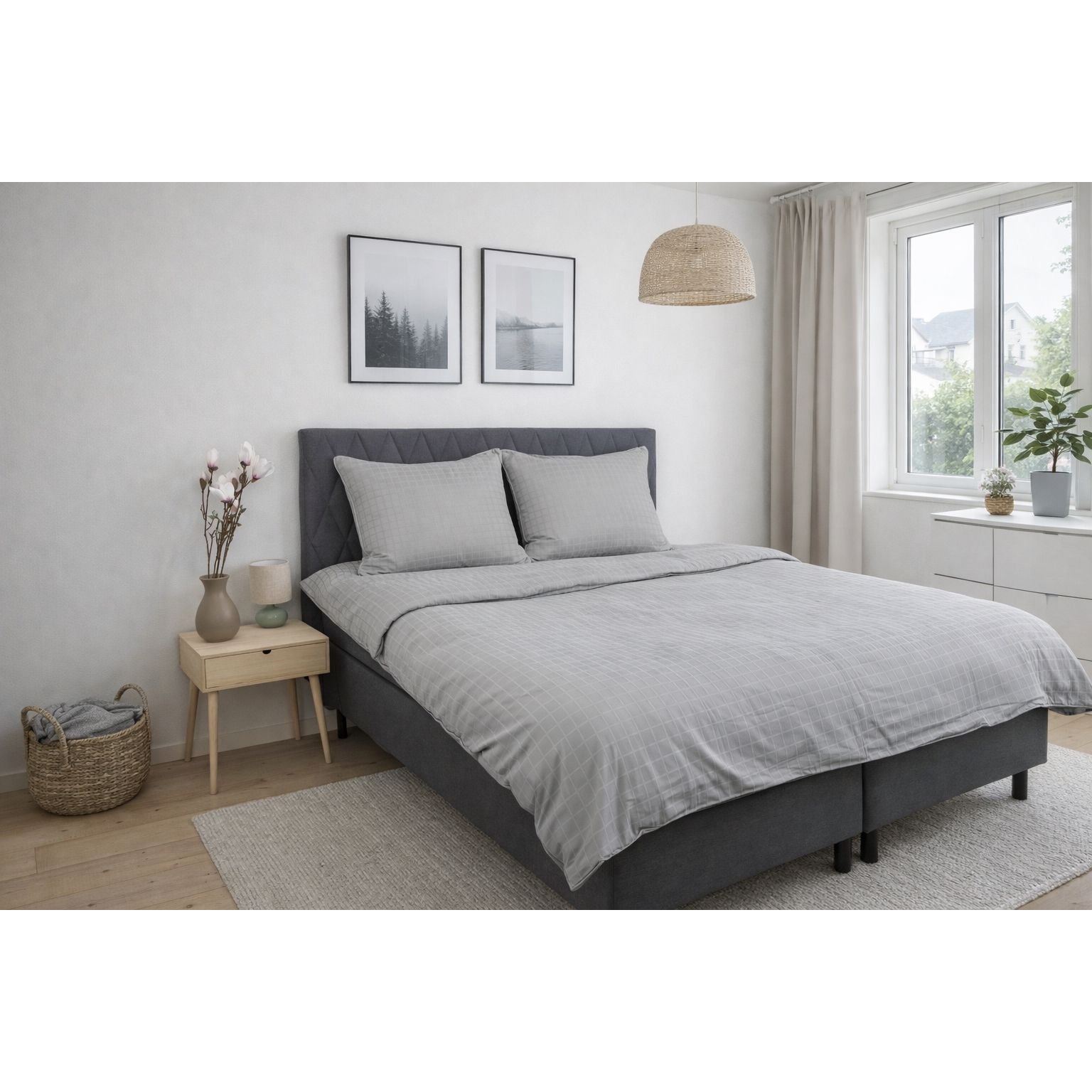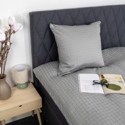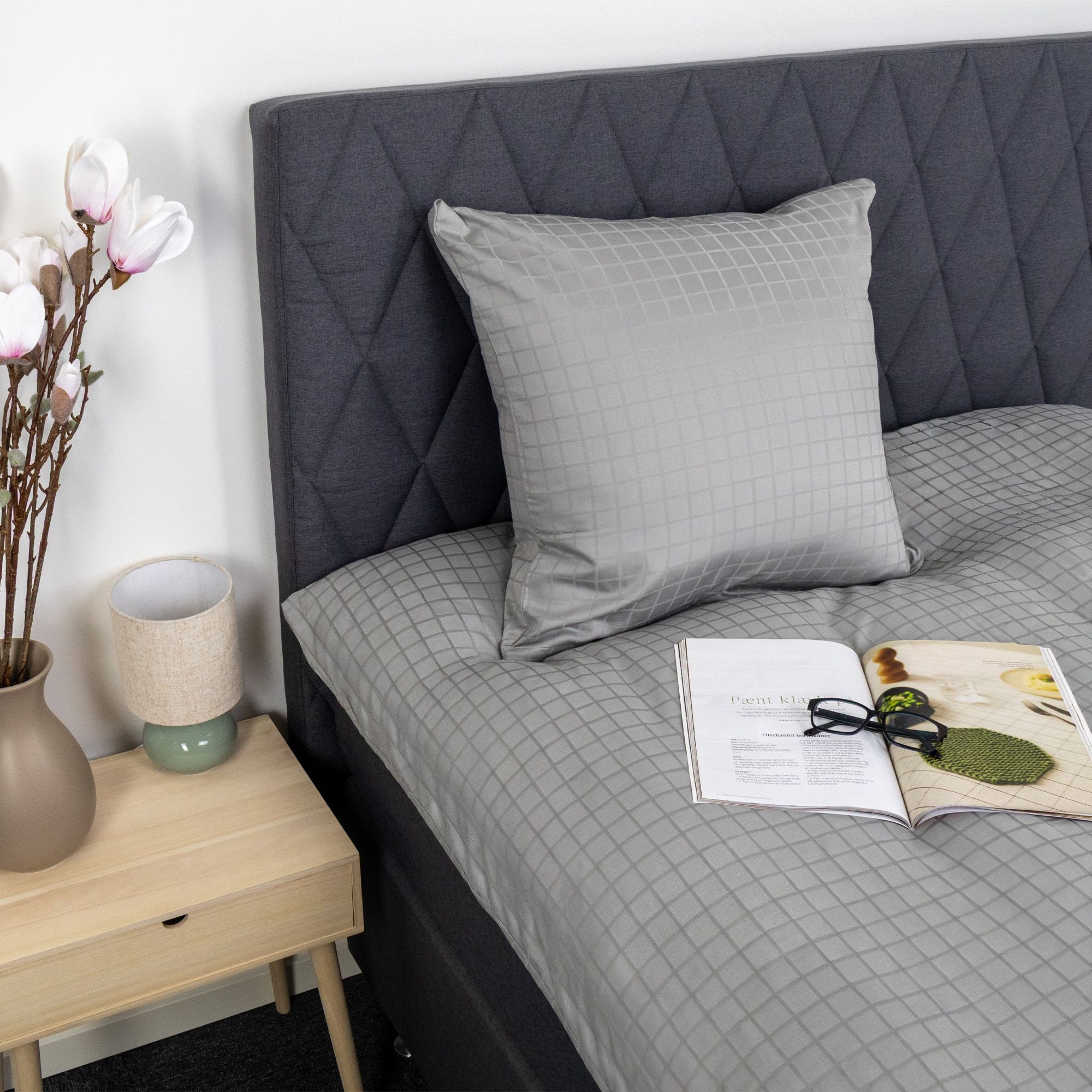 Det jacquardvævede ternede mønster er vævet direkte ind i stoffet og skaber struktur og dybde uden brug af print. Denne vævemetode sikrer, at mønsteret bevarer sit udtryk vask efter vask og giver sengetøjet et eksklusivt og gennemført look. Den grå farve understøtter det rolige design og passer let ind i både moderne og klassiske soveværelser.