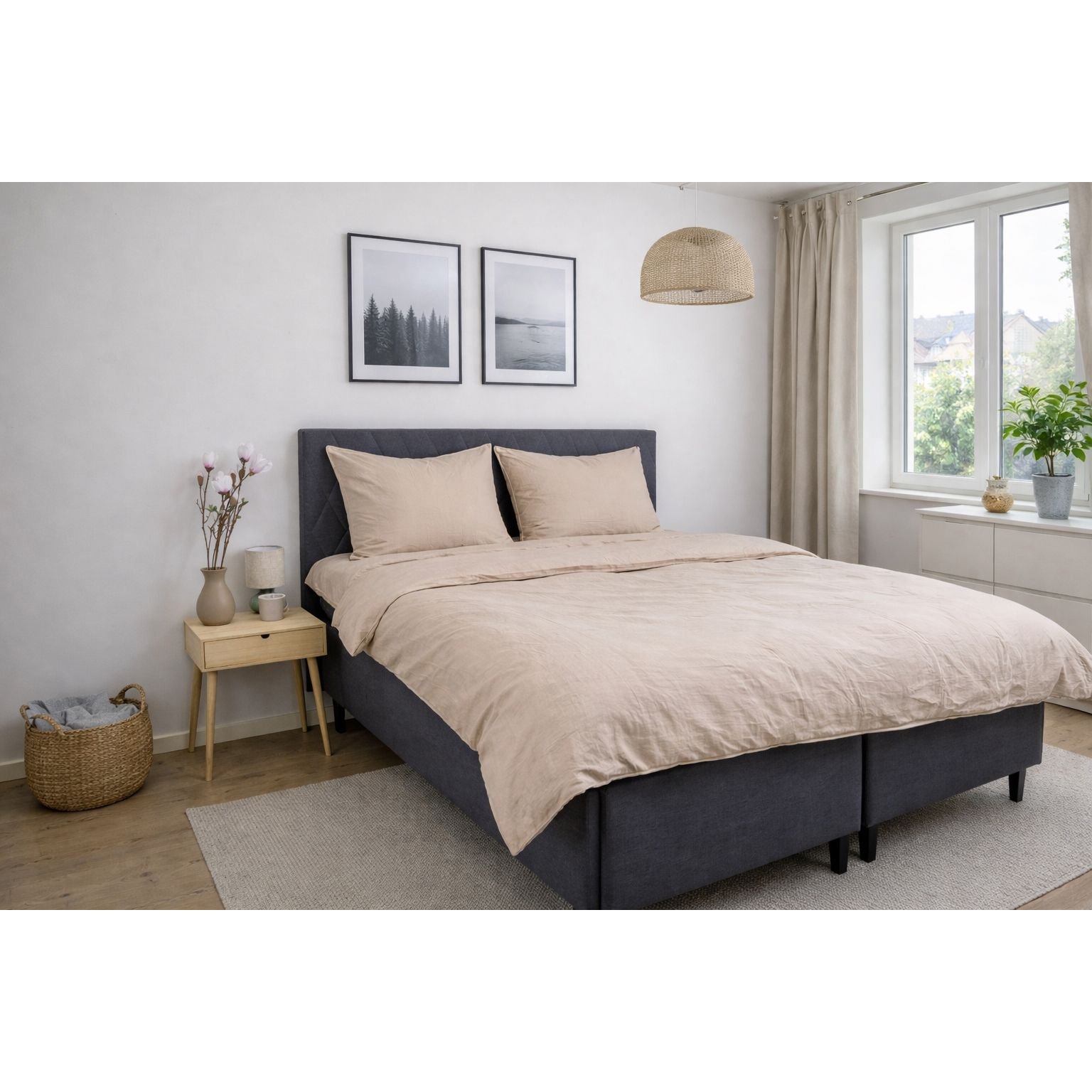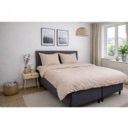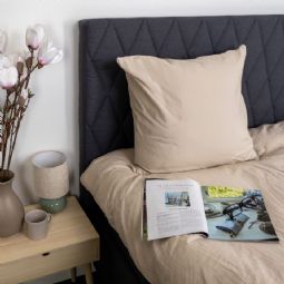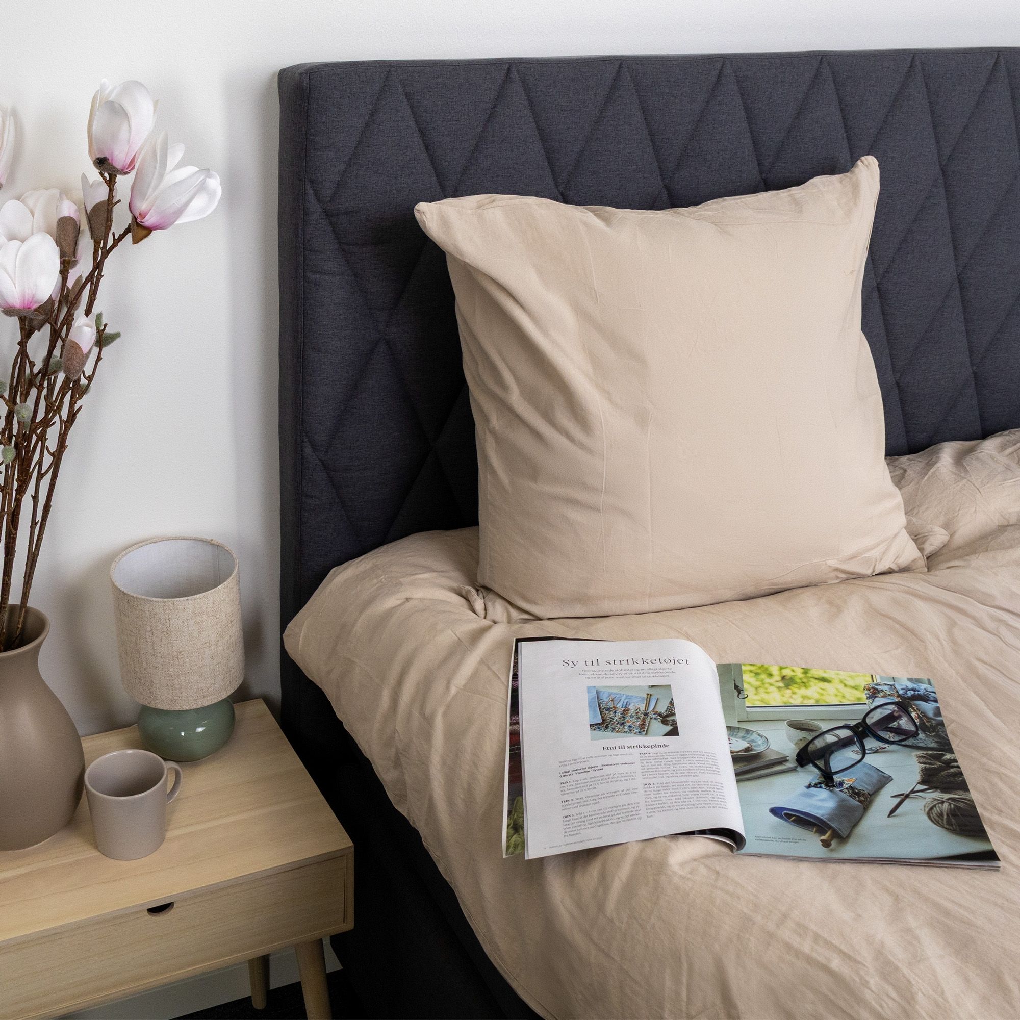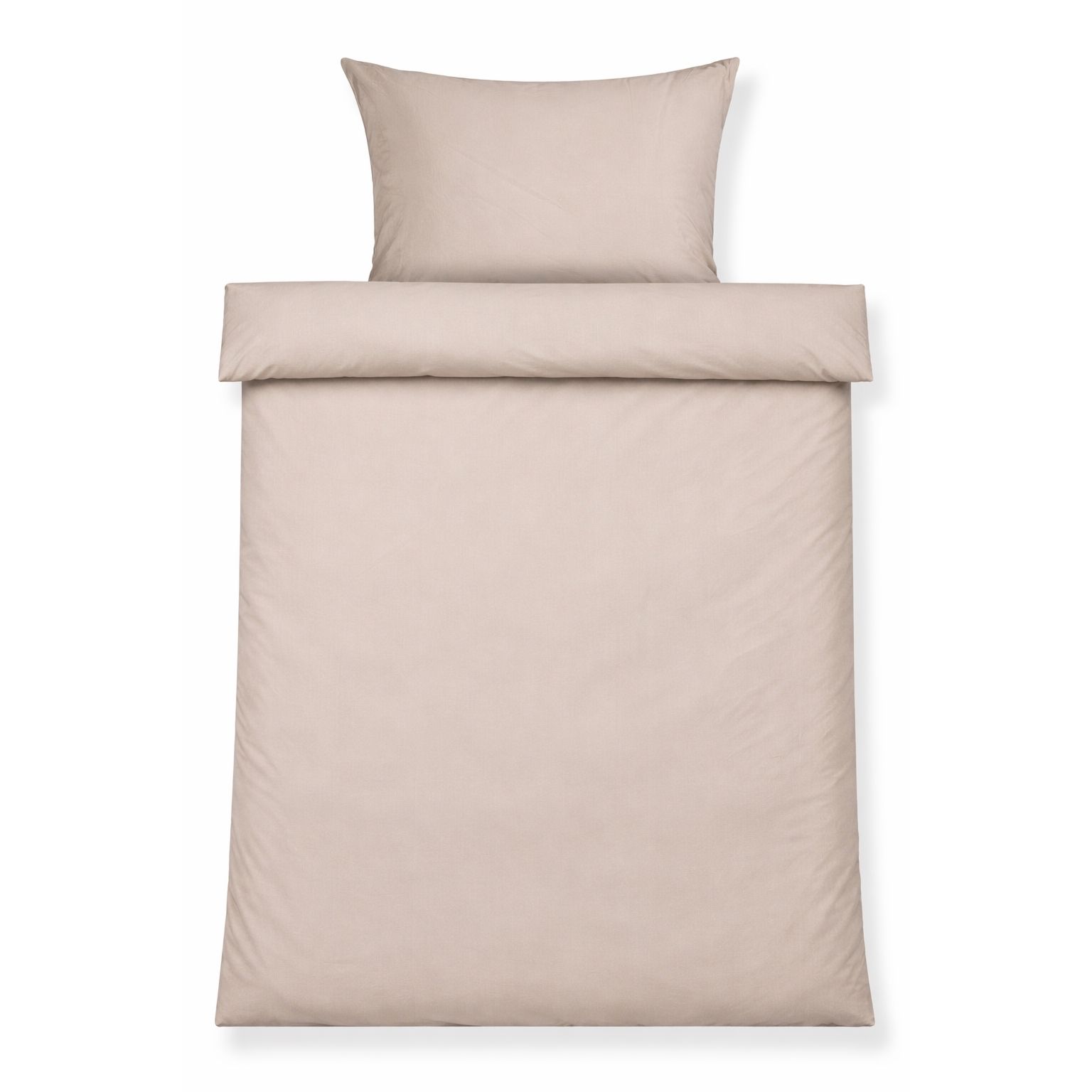 Dyne- og pudebetræk er lukkes med indvendig skjult lynlås, som giver et stilrent udtryk og gør det nemt at skifte sengetøj. Den sandfarvede nuance og det ensfarvede design gør sengesættet let at kombinere med både lyse og mørke elementer i soveværelset.
