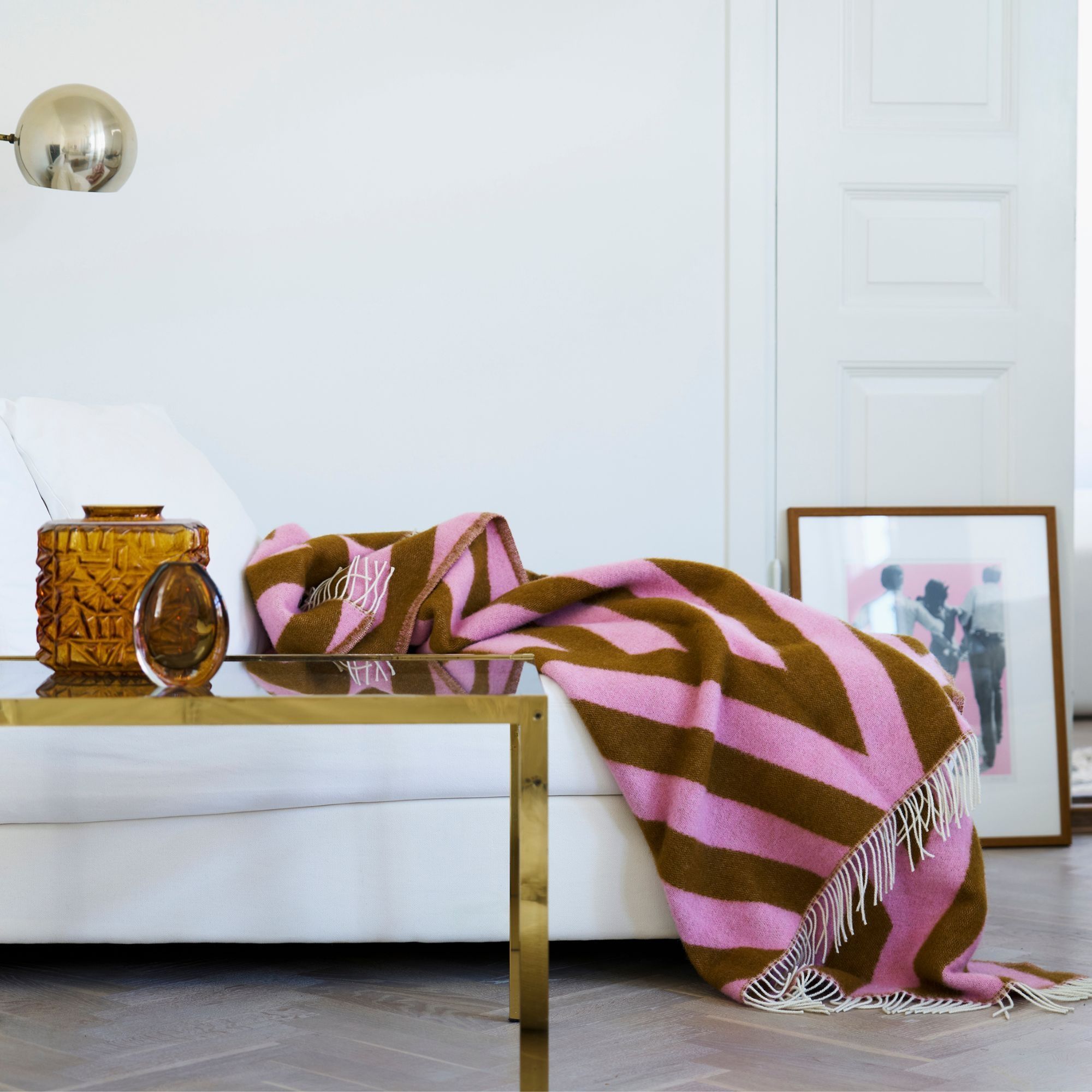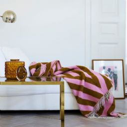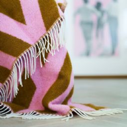 Det grafiske mønster med dynamiske linjer og vinkler skaber et levende og moderne udtryk, mens farvekombinationen i lyserød og rustbrun tilfører energi og personlighed til indretningen. Plaiden fungerer både som et praktisk tæppe og som et dekorativt statement piece.