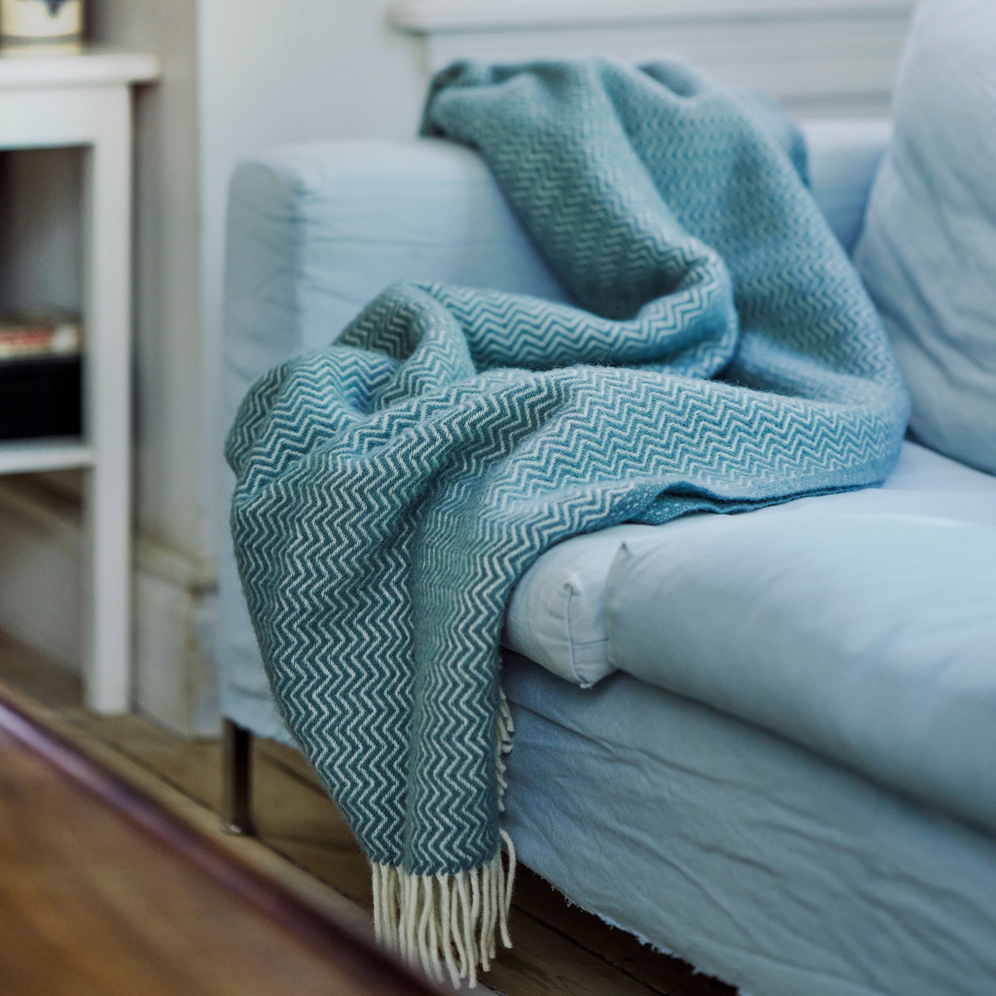Den fine struktur og den smukke blå farve tilfører et stilrent og naturligt udtryk, der passer perfekt ind i moderne skandinavisk indretning. Plaiden fungerer både som et praktisk tæppe og som en dekorativ detalje, der skaber varme og balance i rummet.